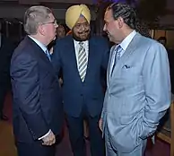 Singh (centre) with IOC President Thomas Bach (left) and Sheikh Ahmed Al-Fahad Al-Ahmed Al-Sabah (right), in 2017