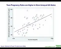 An inverse correlation has been noted between teen pregnancy rates and the quality of education in a state. A positive correlation, albeit weak, appears between a city's teen pregnancy rate and its average summer night temperature, especially in the Southern U.S. (Savageau, compiler, 1993–1995).