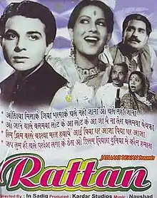 7. 1 2 3 Rattan (1944 film) soundtracks on hindigeetmala.net website Retrieved 5 November 2020