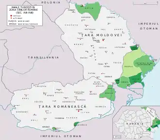 Raya or raia is a term used in Romanian historiography to refer to former territories of the mediaeval principalities of Wallachia and Moldavia held under the direct administration of the Ottoman Empire, as opposed to the principalities, which kept their internal autonomy under Ottoman suzerainty. The term originated from rayah, a generic name for the non-Muslim subjects of the Ottoman Empire.[1] Though mainly populated by Christian populations, a raya was ruled according to Ottoman law.[2]