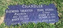 - ↑ Bell, Diane (September 8, 2010). "Ashes of Chandler's wife to join him for eternity". SignOnSanDiego.com. Retrieved 2011-11-26.