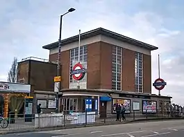 The station, more a halt, was rebuilt, following the start of house building in the locality in the 1930s that saw passenger figures rise from 22,000 per annum in 1930 to 4 million in 1937 by a new station to a design by Charles Holden and Reginald Uren that opened on 8 August 1938.[11] Work had started in earnest with the opening of a temporary timber booking hall and shops on 14 March 1935 allowing work on the new station to proceed.[12] The station, now Grade II Listed by Historic England, features the large cube-shaped brick and glass ticket hall capped with a flat reinforced concrete roof and geometrical forms typical of the new stations built in this period. To the west of the station, there is a reversing siding between the running tracks and, during the day, half of the Piccadilly line service reverses here. Two sidings were located south of the station but these were no longer used: with no connection with the running lines. In late 2017 these sidings were lifted.