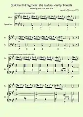Ex. 8 (a) Corelli sonata fragment (b) + continuo realization by Antonio Tonelli[9]