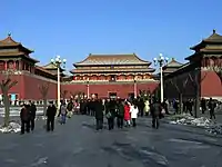 Huge stone blocks from the Imperial Waterway were torn from their foundations so that they could be used as debris to blockade the gates of the Forbidden City, such as the Meridian Gate shown here.[16]
