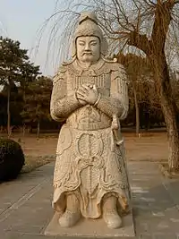 Rewards were given to those who captured the escapees of the plot, including Chen Kui, Grand Defender of Tianjin, who was promoted.[28] On August 9, the Mongol officer Wu Cong was put in charge of the Chief Military Commission of the Left; in September, twenty taels of silver and two-hundred piculs of grain were added to his stipend.[29] Ma Ang was made the Junior Guardian of the Heir Apparent in September.[22] Plaques were made to commemorate the dead who fought against Cao Qin.[30]