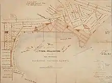 A plan for the New Zealand Company's new settlement of Britannia at Pito-one (Petone) had been prepared in England by Samuel Cobham.[3] The key elements of his city were a large amount of flat land on the shores of a harbour, traversable by a navigable river. When surveyors arrived in 1840 on the Cuba led by Captain William Mein Smith, it was determined that the Hutt River was not navigable and, due to its tendency to flood, was not appropriate to support a major city.[4] For these reasons the new settlement was relocated to the southern shores of Port Nicholson and renamed Wellington.[5]