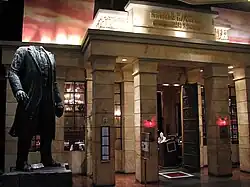 The Red Square restaurants were two of the only depictions of Soviet culture in the United States. Both locations included statues of Lenin out front of the entrance, both covered with fake pigeon feces.[1] After numerous complaints at the Las Vegas location of the statue's depiction of Lenin, resort management cut the head off the statue and displayed it inside the bar.[4] As the Las Vegas location, the statue head of Lenin is displayed in the middle of the bar's vodka vault, cut off from the statue out front of the restaurant.[5]