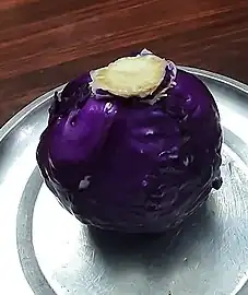 The red cabbage (purple-leaved varieties of Brassica oleracea Capitata Group) is a kind of cabbage, also known as Blaukraut after preparation. Its leaves are coloured dark red/purple. However, the plant changes its colour according to the pH value of the soil due to a pigment belonging to anthocyanins.[1] In acidic soils, the leaves grow more reddish; in neutral soils, they will grow more purple, while an alkaline soil will produce rather greenish-yellow coloured cabbages. This explains the fact that the same plant is known by different colours in various regions. It can be found in all of Europe, throughout the Americas, in China, and especially in Africa.