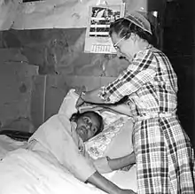 A nurse tends to a woman in an Arizona migrant camp, 1961.