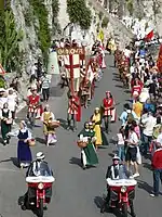 The Amalfi procession represents the society of the Campania Republic at the beginning of the eleventh century, when it reached its peak. Inside there are representatives of the various social classes: the magistrates, the military and the people. In particular parade the duke (the highest city authority) and the knights with sword, whose vestments were later taken by members of the Order of the Knights of St. John of Jerusalem. The proposed episode is that of the marriage between John I, son and co-regent of the Duke Mansone I, and the regal salernitan noblewoman; the marriage marked for the young the passage to the adult age and entry into the political environment. The costumes for the Amalfi procession were designed in the fifties by the scenographer Roberto Scielzo, through analysis of historical sources. The realization boxes, as well as the clothes, are still exhibited in the Municipal Museum of the Amalfi Town Hall.