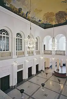 The Max-Littmann-Saal was originally called Großer Saal (Great Hall). After the end of renovation in 2005 it was officially renamed after the architect Max Littmann. The hall of about 455 square meters is 36 meters long, 16 meters high and is surrounded by a large U-shaped gallery. In the case of row seating, the hall accommodates a maximum of 1,160 guests, in the parquet about 660 and on the gallery about 500 seats. It is used for concerts, but also for conferences. Experts count it to the best concert halls of the world.[6] The paneling of cherry-wood gives the hall, which is of the “shoebox type”, a much acclaimed acoustics. Behind the panelling a gap of five to ten centimeters to the wall acts as resonance space. Measurements during the renovation of 2005 brought reverberation times of 1.1 to 1.8 seconds. These acoustics are similar to the Boston Symphony Hall or the Usher Hall in Edinburgh.[7] So the Max-Littmann-Saal often was used for recordings of classical music. In the recent past the Philharmonie Festiva and the conductor Gerd Schaller produced CD recordings of symphonic works of Anton Bruckner,[8] Johannes Brahms, and Franz Schubert,[9] as well as the first recordings of the opera Merlin by Carl Goldmark[10] and the Great Mass by Johann Ritter von Herbeck.[8] Many concerts of the Kissinger Sommer are recorded in the Max-Littmann-Saal by the public broadcasting company Bayerischer Rundfunk. The hall is connected to the neighbouring halls Grüner Saal and Weißer Saal by big foldable doors, which make it possible to enlarge the capacity of the Max-Littmann-Saal.