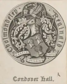He died on 10 February 1896 at Condover Hall and was buried on 13 February in the parish church at Condover.[1] The Condover estate passed to his younger brother, the Reverend Richard Hugh Cholmondeley (1828–1910).[20] The Condover estate and the collections of books, paintings, furniture and armour were sold in 1897.[20][56] The Condover estate was purchased in 1897 by Edward Fielden, who later sold it in 1926.[12]