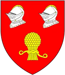 Arms of Cholmondeley of Vale Royal: Gules, 2 esquires' helmets proper in chief, garnished Or, in base a garb, Or[3]