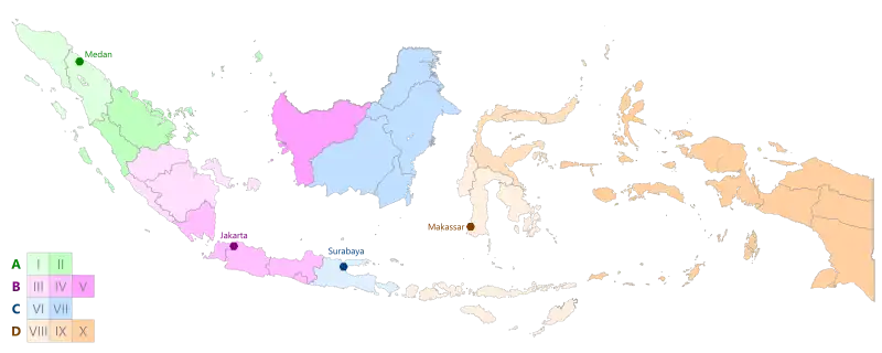 | Development Region X | Maluku, North Maluku, Central Papua, Highland Papua, Papua, South Papua, Southwest Papua, and West Papua |