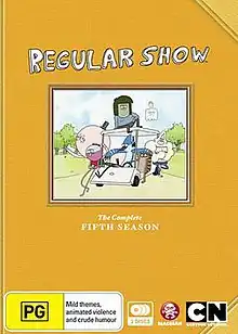 The fifth season of American animated comedy television series Regular Show, created by J. G. Quintel, originally aired on Cartoon Network in the United States. Quintel created the series' pilot using characters from his comedy shorts for the canceled anthology series The Cartoonstitute. He developed Regular Show from his own experiences in college. Simultaneously, several of the show's main characters originated from his animated shorts 2 in the AM PM and The Naïve Man from Lolliland. Following its fourth season's success, Regular Show was renewed for a fifth season on November 1, 2012.[1][2] The season ran from September 2, 2013 to August 14, 2014 and was produced by Cartoon Network Studios.[3]