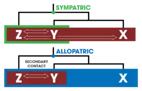 Phylogenetic signature to distinguish sympatric speciation from reinforcement. Stronger prezygotic isolation (indicated by the red boxes and associated arrows) should be detected between Z and Y and between Z and X if species Z sympatrically speciated (green) from the common ancestor of species Y and X. If Z, Y, and X speciated allopatrically (blue), with Z and Y experiencing secondary contact, strong prezygotic isolation should be found between Z and Y, but not between Z and X.[45]