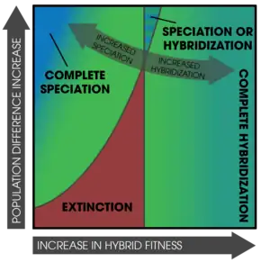 A parameter space representing the conditions in which speciation by reinforcement can occur. Here, three outcomes can arise: 1) extinction of one of the initial populations; 2) the initial populations can hybridize; 3) the initial populations can speciate. The outcomes are determined by both initial divergence and level of fitness of the hybrids.[23]