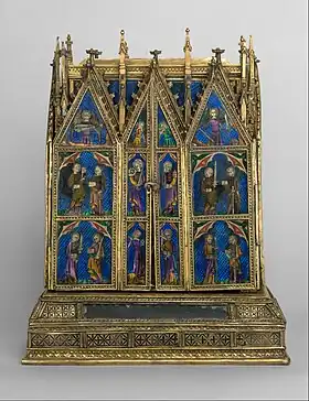 The Reliquary Shrine is an especially complex 14th century container for relics, now in The Cloisters, New York. It is made from translucent enamel, gilt-silver and paint, and dated to c 1325–50. Although first mentioned in a convent in Budapest, its style and influences betrays French craftsmanship. It has been proposed to be attributed by the Met to Jean de Toul written Jehan de Touyl in one French source from 1328, a French goldsmith about whom little is known, but who is associated with a small number of works with similar stylistic characteristics.[1]