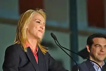 Following the elections, Dourou was appointed to the Shadow Cabinet of Alexis Tsipras, where she was made responsible for foreign policy.[6] In the beginning, Dourou had to cope with prejudices against female politicians, with a Kathimerini commentator railing that the "nice blonde" be rather "a qualified kindergarten teacher" than qualified on foreign policy issues.[7] However, she fought her way through male dominance and sexism, defining Syriza's defence and foreign policy, as to be increasingly described her party's "rising star".[4]