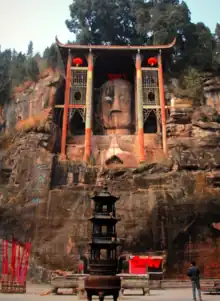Renshou Giant Buddha (traditional Chinese: 仁壽大佛; simplified Chinese: 仁寿大佛; pinyin: Rénshòu Dàfó), also known as Niujiaozhai Giant Buddha (牛角寨大佛), is a large stone Buddha located within Renshou County, Sichuan. It is 60 kilometers south of Chengdu.[1] The Buddha was carved in 707 during the Tang dynasty. It was constructed six years earlier in the nearby famous Leshan Giant Buddha. Located around the statue are over 101 shrines belonging to Buddhism, Confucianism, and Taoism.[2]