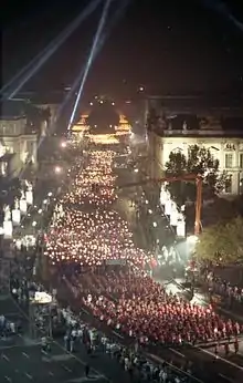 A torchlight procession in the center of Berlin on the occasion of the 40th anniversary Republic Day.