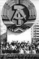 On the occasion of the Day of the Republic, special stamps were issued every five years for the State Birthday of the GDR. Since the 1970s, the day became more and more the people's holiday, without the demonstrations, but with folk festival character. In 1976, the Palace of the Republic was opened on republic day.[4] On Republic Day in 1977, violent clashes between the People's Police and young people took place on Alexanderplatz in Berlin. They shouted slogans like "Down with the GDR!" Or "Give Peace a Chance" and many of whom were arrested and sentenced.[5][6]
