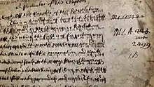 It is part of a medieval florilegium, now known as "Westminster Cathedral Treasury, MS 4", which was inscribed on parchment c.1450–1500.[49] The manuscript has '1368' written on the opening folio. Along with Revelations of Divine Love, "Westminster Cathedral Treasury, MS 4" also contains commentaries on Psalms 90 and 91, purportedly by the 14th century Augustinian mystic Walter Hilton, and a compilation of Hilton's The Scale of Perfection. During the 16th century it was owned by the Catholic Lowe family. In 1821, Bishop James Bramson made a hand calculation of the age of the manuscript on its endpaper.[50][49] Rediscovered in August 1955, it is kept in the archives of Westminster Abbey, on loan from Westminster Cathedral.[49]