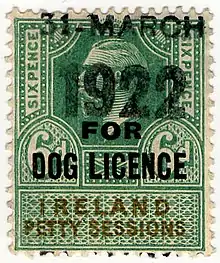 The Irish Free State (Irish: Saorstát Éireann) was established at the end of 1922, and British or Irish revenues were once again similarly overprinted. Saorstát overprints may be found on Contract Note, County Courts, Dog Licence Registration, Estate Duty, Excise, Foreign Bill, Judicature, Land Commission, Land Registry, National Health Insurance, Petty Sessions, Public Records, Registration of Deeds and Unemployment Insurance stamps.[3]