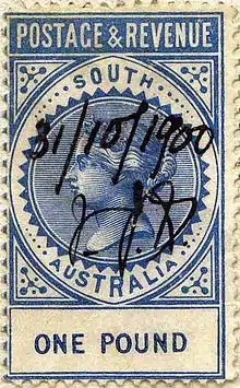 The Australian state of South Australia issued revenue stamps from 1894 to 2003. There were various types for different taxes.[1]