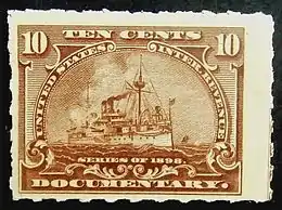 In the continuation of providing funding for the Spanish–American War Congress authorized a tax on a wide range of goods and services including various alcohol and tobacco products, tea and other amusements and also on various legal and business transactions (such as Stock certificates, bills of lading, manifests, and marine insurance). To pay these tax duties revenue tax stamps were purchased and affixed to the taxable item or respective certificate.[25][26] There are seventeen stamps in this issue which occur in denominations ranging from ½-cent to 50-dollars which were printed on double lined watermarked paper. Two types of perforations were used: Rouletted perforations and 'hyphen' shaped perforations. Numerous double transfers occur (doubled image) in this issue.[27]