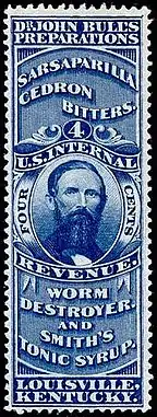 After the tax laws were passed in 1862, private proprietors were allowed to furnish their own stamps, subject to the approval of the Internal Revenue and subsequently were granted a discount on the taxes paid for the goods they sold. Private stamps offered the advantage of having the proprietor's name depicted on the stamp.[34] The proprietor paid the cost of engraving the die and the printing plates which in the beginning varied considerably. Some proprietors paid as little as $60 while others paid as much as $750. After June 1, 1863 a uniform cost of $350 was adopted for all dies with a couple of exceptions for large ones.[35]