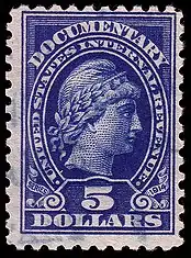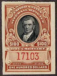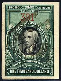 The three Documentary stamps issued in the 1898 series (which were actually issued in 1899) feature the portraits of John Marshall, Alexander Hamilton and James Madison, each bearing the inscription Series of 1898. These three designs were also used in the 1914, 1917 printings and much later in 1940 issues, with slight modifications in the design. i.e.The inscription Series of 1898 was removed. As an added security measure each of these high value stamps was given its own unique serial number.[29] Produced by the Bureau of Engraving and Printing the issues of 1898 were printed on white wove paper and watermarked with the initials U.S.I.R. (i.e. United States Internal revenue) in block capital letters. The stamps were separated by rouletted perforations.[30] The issues of 1917 and 1940 were also printed on double lined watermarked paper with standard gauge 12 perforations.[31]