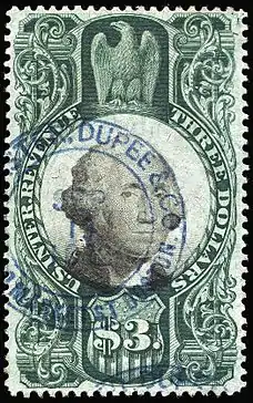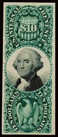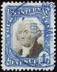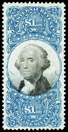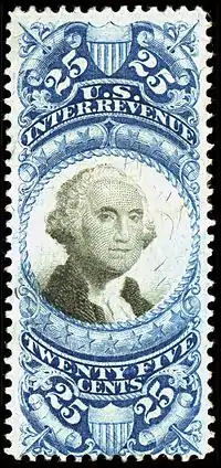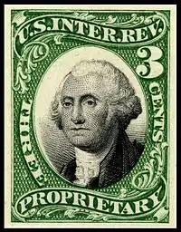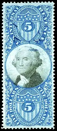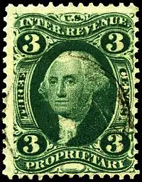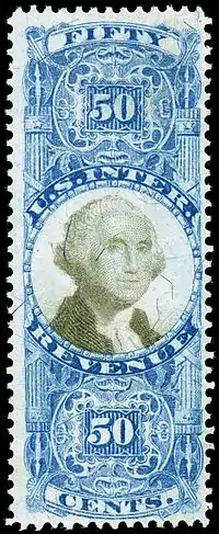 The first revenue stamps in the United States were used briefly during colonial times, among the most notable usage involved the Stamp Act. Long after independence, the first revenue stamps printed by the United States government were issued in the midst of the American Civil War, prompted by the urgent need to raise revenue to pay for the great costs it incurred. After the war ended however, revenue stamps and the taxes they represented still continued. Revenue stamps served to pay tax duties on items that came under two main categories, Proprietary and Documentary. Proprietary stamps paid tax duties on goods like alcohol and tobacco, and were also used for various services, while Documentary stamps paid duties on legal documents, mortgage deeds, stocks and a fair number of other legal dealings. Proprietary and Documentary stamps often bore these respective designations, while in several of the issues they shared the same designs, sometimes with minor variations. Beginning in 1862 the first revenue stamps were issued, and would continue to be used for another hundred years and more. For the first twelve years George Washington was the only subject featured on U.S. revenue stamps, when in 1875 an allegorical figure of Liberty finally appeared. Revenue stamps were printed in many varieties and denominations and are widely sought after by collectors and historians. Revenue stamps were finally discontinued on December 31, 1967.