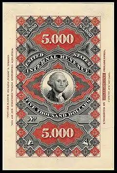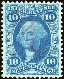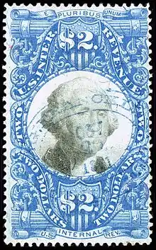 The second issue of revenue stamps were Documentary stamps and issued in 1871. After the Internal Revenue received many reports of the fraudulent re-use of revenue stamps, typically with cancellation ink washed or otherwise removed from the face of the stamp,[13] a letter of May 31, 1867 from government officials in Wall Street was sent to Internal Revenue commissioner E.A. Rollins expressing the concern that "The U.S. government loses thousands of dollars daily by stamps being used a second time." The ordinary stamps in use at this time did not receive the cancellation ink very well, unless it was heavily applied.[14] The letter advised that all stamps be printed in a pale yellow color. This particular suggestion however was not taken up by Butler & Carpenter, but instead, after a period of experimentation, they responded to the problem by producing stamps of a lighter shade and on a paper that more readily absorbed cancellation ink.[14] The Internal revenue was frequently sending stamps suspected of having cancellation ink washed to the engravers and printers for inspection to determine if they had been tampered with.[15]