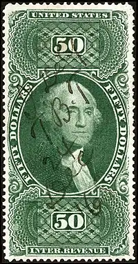 The first series of revenue stamps have two distinctive design types with each stamp designating the tax 'duty'. Designs for denominations 1-cent through 20-cents were simple, bearing a portrait of George Washington, while stamps with denominations 25-cents through 1-dollar are larger and have a more elaborate design and also designate the tax duty in a lower banner. Stamps with denominations of $1.30 were used to pay the tax duty for foreign exchange only, $1.50 for Inland exchange only while the stamps with denominations of $1.60 and $1.90 were for Foreign exchange only and oddly bear no duty designations in the stamp design. Denominations of 2-dollars through 10-dollars have tax duties designated in the lower circular banner surrounding Washington's portrait. Denominations of 15-dollars through 50-dollars have tax duties designated in the right side of the circular banner surrounding the portrait. The design used for the 1-cent denomination is unique and is not used for any other denomination.[11]