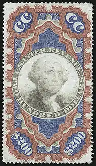 The new paper was finally employed in stamp production in early 1869[14] and by 1871 a second series of stamps were issued, printed on a special patented "chameleon" paper containing silk fibers which can be seen in the paper with the naked eye.[13] Still produced by Butler & Carpenter of Philadelphia, the entire second series, with the exception of the 200-dollar issue, were printed in the same bi-color combination, with the portrait of Washington printed in black and with the frame work in blue with various ornate and elaborate designs, popular during that period.