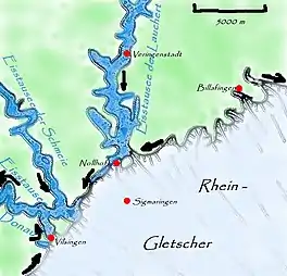 Reconstruction of the front of the Rhine glacier near Sigmaringen showing blockage the Danube course during the Riss glaciation.