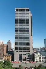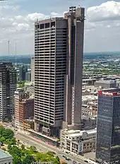The James A. Rhodes State Office Tower is a 41-story, 629-foot (192 m) state office building and skyscraper on Capitol Square in Downtown Columbus, Ohio. The Rhodes Tower is the tallest building in Columbus and the fifth tallest in Ohio. The tower is named for James A. Rhodes, the longest-serving Ohio governor, and features a statue of Rhodes outside the entrance. The building's interior includes a large open lobby with 22 elevators. Higher floors have offices for numerous state agencies. The tower's 40th floor contains an observation deck, open to the public.