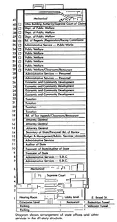 Its first floor was designed with a five-story galleria-like lobby, a unique feature made possible by the building's elevator placement. The center of the lobby has a winding staircase leading up to the former Supreme Court level as well as two escalators that lead to the basement's restaurant and passage to the Statehouse garage.[17][11] Towards the back of the lobby is a stainless steel recreation of the Great Seal of Ohio.[11] The floorplans of the building are column-free, 144 feet square. All of the building's elevators (20 for passengers and two for freight[11]) and service shafts were designed outside of the square office space, at the north and east (back and side of the building).[10][17] The elevators include express elevators that skip floors between the lobby and 18th floor. One of these elevators malfunctioned in 2021 with no injuries.[29]