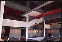 The four floors originally for the Ohio Supreme Court, directly above the lobby, were described in 1975 as an impressive "polished steel and glass enclave" with cushioned flaming scarlet carpeting. The main courtroom had leather high-back chairs behind a polished red granite bench. Behind the seats was a smaller version of the steel Ohio seal in the building's lobby. The courtroom connected to a corridor leading to justices' chambers, containing teakwood desks, velvet furniture, spacious work areas, and private individual showers. Each of these chambers was fronted by a wall of glass, and had a private mahogany-paneled elevator.[11] The building's fourth floor contained the Supreme Court's 150,000-volume law library, with teak shelving, plush furniture, custom drapes and scarlet carpeting, as recorded in 1975.[11]