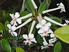 Growing to 2.5 m (8.2 ft) in height, it is an evergreen shrub with clusters of slightly fragrant, narrowly trumpet-shaped flowers that open pink, turning white.[2]