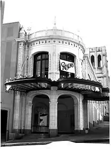 The walls are patterned, buff-toned stucco with a muted backdrop for the classical decorative features. The decorative features are glazed, white terra cotta and applied around the main entrance. The roof above the auditorium is gabled and flat, abutting the parapets. It is brick and hollow clay tile construction with a steel truss roof system over the auditorium. Reinforced concrete beams support the proscenium arch and balcony.[2] The main entrance is rounded at the northeast corner and sheathed in the terra cotta. The classical decorative features are concentrated around the entrance. Three arched openings form a semi-circular arcaded entry with a ticket window, a double leaf glass door, and terrazzo flooring and marble kickplating. A replicated three-part flower petal marquee projects out over the entranceway. The second story is enclosed and capped with decorative parapet with lighted finials. The fenestration on the upper facade of the turret-like corner mirrors the arcaded entry below and features three sets of segmented arch windows.[2] The remainder of the primary facade is less ornamented. The stuccoed wall surface is divided into six bays along the length by terra cotta piers of classical design. The decorative terra cotta parapet extends the entire length with lighted finials where the piers abut the cornice line. Adjacent to the main entry, the upper story of the first three bays features fenestration and an ornamented cornice.[2] Lighted finials smaller than the pier finials adorn the parapet. Storefronts occupied the first bays along the second level from the northwest corner.[2] The Market Street front has a replicated storefront on the corner and a stairwell from an emergency exit serving the auditorium below.[2]
