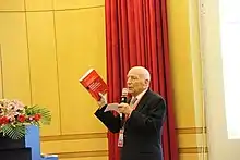 Professor Richard B. Hetnarski, at the opening ceremony of the 10th International Congress on Thermal Stresses in Nanjing, China, on 1 Jun 2013. He is presenting the book "Theory of Elasticity and Thermal Stresses" which just got published.