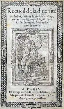Breton produced the costume book, Recueil de la diversité des Habits qui sont des present en usaige tant es Pays D'Europe, Asie, Afrique, et isles sauvages, (Paris 1562) with 121 woodcuts, and a dedication to Henry of Navarre by his colleague François Desprez. The first edition was printed in Civilité type, a special italic typeface used for children's books. Two subsequent editions in Breton's lifetime employed roman type.