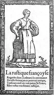 Costume of the French countrywoman, woodcut from Breton's Recueil des Habits (1564)