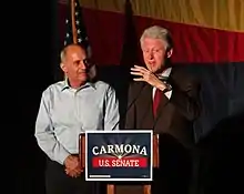 In August 2006, Carmona returned home to Tucson, Arizona.[2] In November 2011, he announced he would seek the Democratic Party's nomination for United States Senate in the hopes of succeeding outgoing Republican Senator Jon Kyl, despite being registered as a political independent.[3] He narrowly lost to Republican challenger Congressman Jeff Flake.[4]