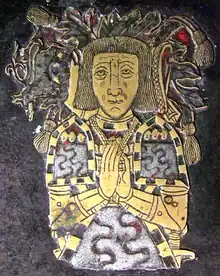 He died in 1538, between 28 October and 2 December,[23] and was buried in Ightham Church, where survives the upper fragment of his monumental brass, which shows his coat of arms upright in an inverted shield, to indicate his death, an unusual depiction.[24] A separate shield shows the arms of Clement impaling Catesby (Argent, two lions passant sable crowned or).[25] The inscription (with Sir Richard's date of death left blank) is as follows:[26]