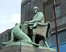 A statue by Edward William Wyon (1811–1885), of Green stands outside the Poplar Baths, his face modeled from his death mask; with him is his faithful Newfoundland dog "Hector". The dog famously lost its ear in 1967 when a young boy got stuck climbing the statue, and the Fire Services had to cut him away. On the side of the statue there are two Bas reliefs, to commemorate his shipbuilding exploits; on one side is the Arapiles which was still under construction in his shipyard on his death, and on the other side the record-breaking Clipper Challenger which he built in 1852 to challenge American rivals in the tea trade.[2]