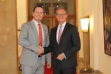Grenell presented his credentials to the President of Germany on May 8, 2018.[38] Within hours of taking office, Grenell offended German diplomats and business leaders when he tweeted that "German companies doing business in Iran should wind down operations immediately".[39] The tweet was widely perceived as a threat, with the Foreign Minister of Luxembourg, Jean Asselborn, commenting that "This man was accredited as ambassador only yesterday. To give German businesses such orders (…) that is just not how you can treat your allies".[40] The leader of Germany's Social Democratic Party said that Grenell "does appear to need some tutoring" in the "fine art of diplomacy", while the Left Party urged the Merkel government to summon Grenell to explain his comments.[40]