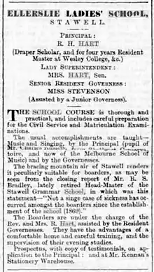 About 1880 Hart established the Ellerslie Ladies' School. He ran the school with the assistance of his parents, his wife and employees.[4] There is an intriguing public apology from Mr Charles Dumorguo for apparently impugning the Character of Hart and his school. The apology is published twice on successive days in the Melbourne Argus newspaper.[5] He was an active member of the local Masonic Lodge in Stawell and a founding member of the local ANA Branch.[6]
